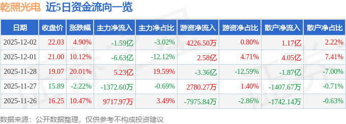 证券之星消息,截至2025年12月2日收盘,乾照光电(300102)报收于22.03元,上涨4.9%,换手率27.3%,成交量250.19万手,成交额52.54亿元。