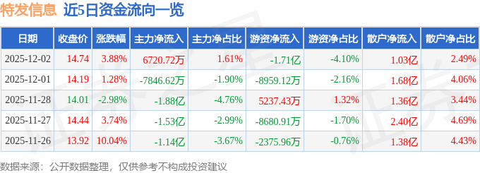 证券之星消息,截至2025年12月2日收盘,特发信息(000070)报收于14.74元,上涨3.88%,换手率32.15%,成交量285.69万手,成交额41.62亿元。