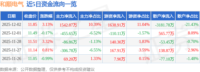 证券之星消息,截至2025年12月2日收盘,和顺电气(300141)报收于11.85元,上涨3.13%,换手率4.93%,成交量12.57万手,成交额1.48亿元。