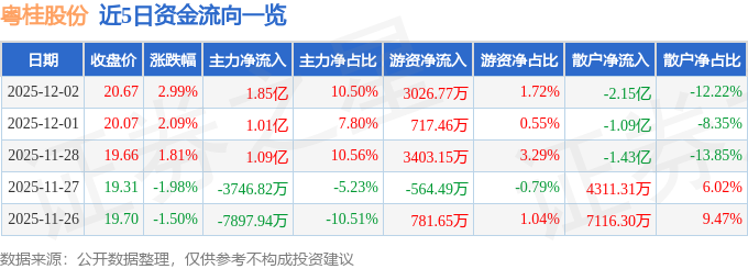 证券之星消息,截至2025年12月2日收盘,粤桂股份(000833)报收于20.67元,上涨2.99%,换手率18.66%,成交量84.65万手,成交额17.6亿元。