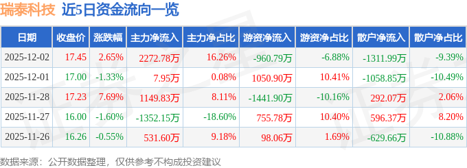 证券之星消息,截至2025年12月2日收盘,瑞泰科技(002066)报收于17.45元,上涨2.65%,换手率3.49%,成交量8.06万手,成交额1.4亿元。