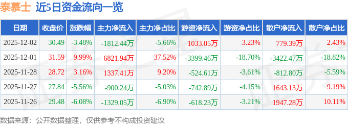 证券之星消息,截至2025年12月2日收盘,泰慕士(001234)报收于30.49元,下跌3.48%,换手率11.41%,成交量10.44万手,成交额3.2亿元。
