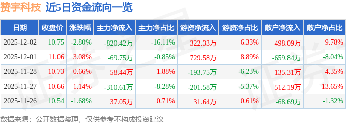 12月2日的资金流向数据方面,主力资金净流出820.42万元,占总成交额16.11%,游资资金净流入322.33万元,占总成交额6.33%,散户资金净流入498.09万元,占总成交额9.78%。