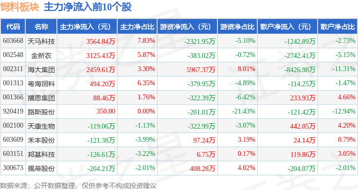 从资金流向上来看,当日饲料板块主力资金净流入3428.18万元,游资资金净流入5720.47万元,散户资金净流出9148.65万元。饲料板块个股资金流向见下表: