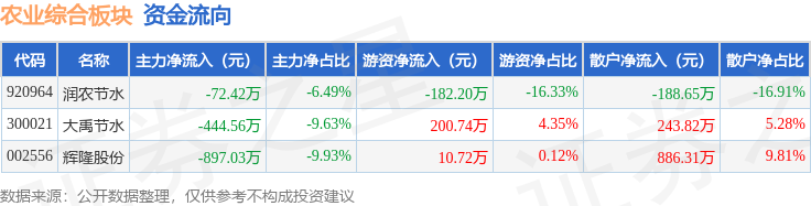 从资金流向上来看,当日农业综合板块主力资金净流出1341.59万元,游资资金净流入211.47万元,散户资金净流入1130.12万元。农业综合板块个股资金流向见下表: