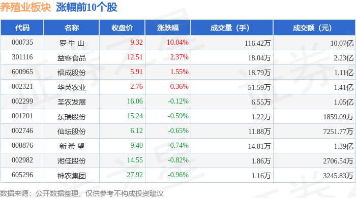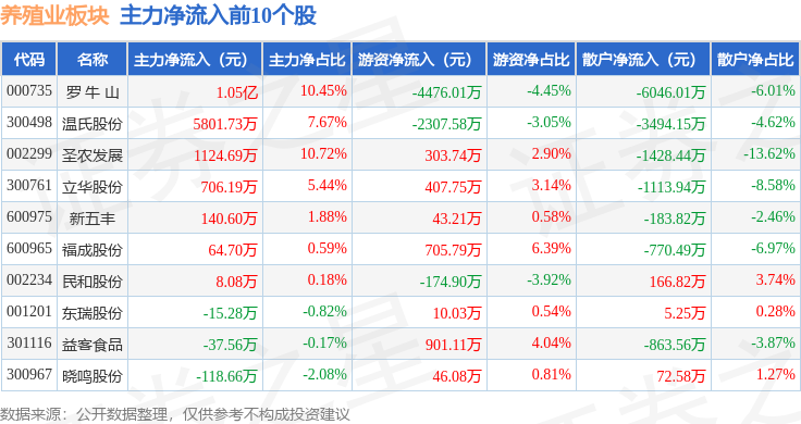 从资金流向上来看,当日养殖业板块主力资金净流出1.45亿元,游资资金净流出628.35万元,散户资金净流入1.51亿元。养殖业板块个股资金流向见下表: