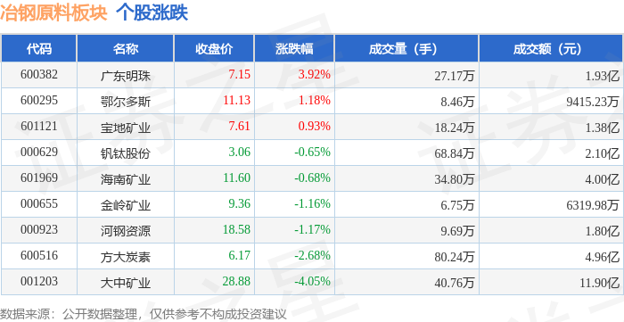 从资金流向上来看,当日冶钢原料板块主力资金净流出2.64亿元,游资资金净流出8140.08万元,散户资金净流入3.45亿元。冶钢原料板块个股资金流向见下表: