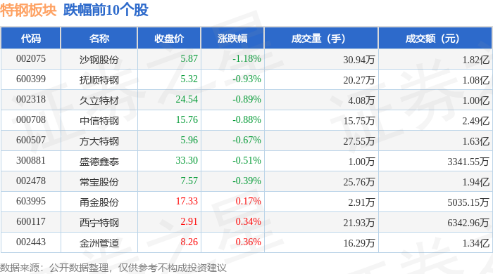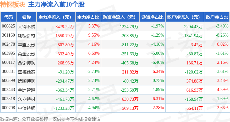 从资金流向上来看,当日特钢板块主力资金净流出945.51万元,游资资金净流出2001.52万元,散户资金净流入2947.03万元。特钢板块个股资金流向见下表:
