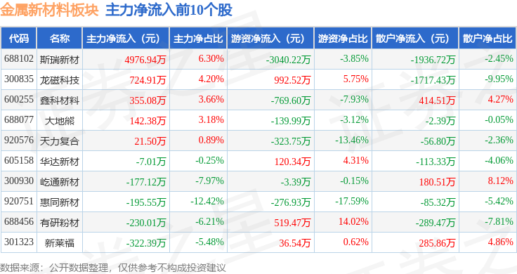 从资金流向上来看,当日金属新材料板块主力资金净流出3.49亿元,游资资金净流出1473.91万元,散户资金净流入3.64亿元。金属新材料板块个股资金流向见下表: