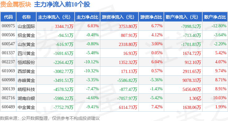 从资金流向上来看,当日贵金属板块主力资金净流出3.93亿元,游资资金净流入6250.74万元,散户资金净流入3.31亿元。贵金属板块个股资金流向见下表: