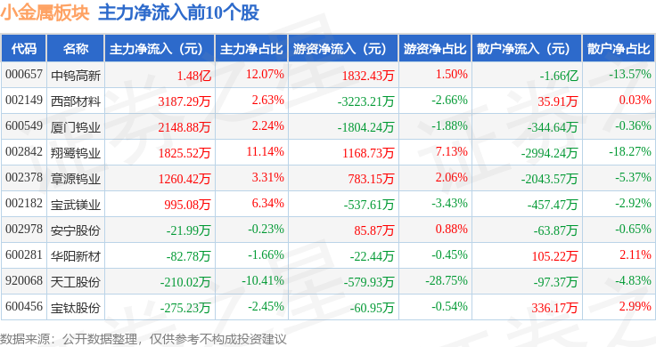 从资金流向上来看,当日小金属板块主力资金净流出8.08亿元,游资资金净流入2.88亿元,散户资金净流入5.19亿元。小金属板块个股资金流向见下表: