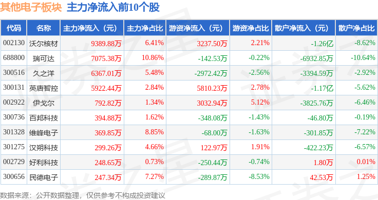 从资金流向上来看,当日其他电子板块主力资金净流出11.28亿元,游资资金净流入3.24亿元,散户资金净流入8.03亿元。其他电子板块个股资金流向见下表: