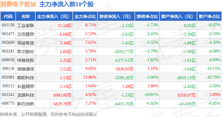 从资金流向上来看,当日消费电子板块主力资金净流入14.67亿元,游资资金净流出3.92亿元,散户资金净流出10.75亿元。消费电子板块个股资金流向见下表: