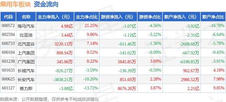 从资金流向上来看,当日乘用车板块主力资金净流入5.32亿元,游资资金净流出7421.15万元,散户资金净流出4.57亿元。乘用车板块个股资金流向见下表: