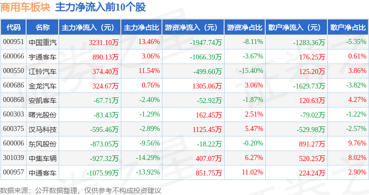从资金流向上来看,当日商用车板块主力资金净流出7226.71万元,游资资金净流入4689.24万元,散户资金净流入2537.47万元。商用车板块个股资金流向见下表: