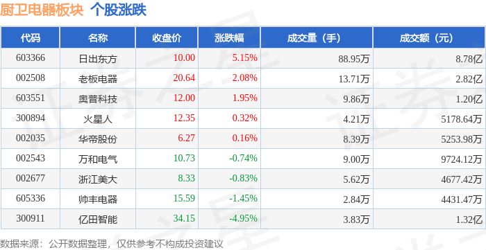 证券之星消息,12月2日厨卫电器板块较上一交易日上涨0.76%,日出东方领涨。当日上证指数报收于3897.71,下跌0.42%。深证成指报收于13056.7,下跌0.68%。厨卫电器板块个股涨跌见下表: