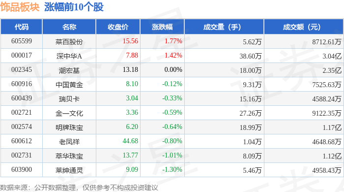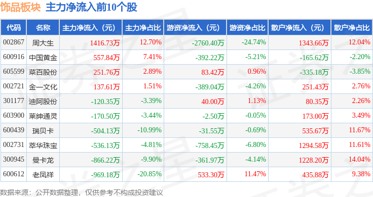 从资金流向上来看,当日饰品板块主力资金净流出9736.98万元,游资资金净流出3696.48万元,散户资金净流入1.34亿元。饰品板块个股资金流向见下表:
