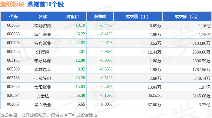 证券之星消息,12月2日造纸板块较上一交易日下跌0.34%,松炀资源领跌。当日上证指数报收于3897.71,下跌0.42%。深证成指报收于13056.7,下跌0.68%。造纸板块个股涨跌见下表:
