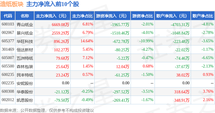 从资金流向上来看,当日造纸板块主力资金净流出2341.57万元,游资资金净流出504.28万元,散户资金净流入2845.85万元。造纸板块个股资金流向见下表: