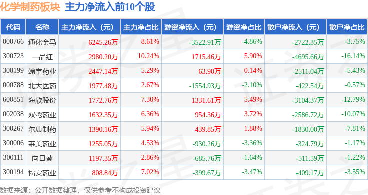 从资金流向上来看,当日化学制药板块主力资金净流出13.52亿元,游资资金净流入1.98亿元,散户资金净流入11.54亿元。化学制药板块个股资金流向见下表: