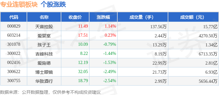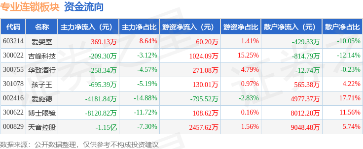 从资金流向上来看,当日专业连锁板块主力资金净流出2.46亿元,游资资金净流入3256.1万元,散户资金净流入2.13亿元。专业连锁板块个股资金流向见下表: