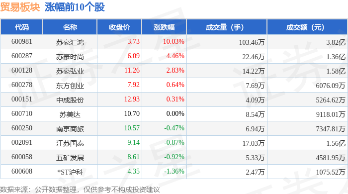 证券之星消息,12月2日贸易板块较上一交易日上涨0.38%,苏豪汇鸿领涨。当日上证指数报收于3897.71,下跌0.42%。深证成指报收于13056.7,下跌0.68%。贸易板块个股涨跌见下表: