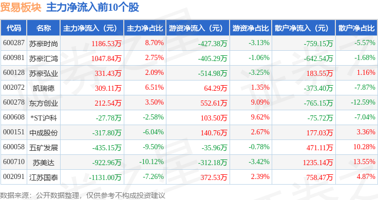 从资金流向上来看,当日贸易板块主力资金净流出7847.78万元,游资资金净流入1653.88万元,散户资金净流入6193.9万元。贸易板块个股资金流向见下表: