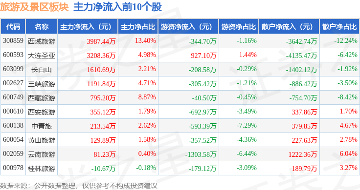 从资金流向上来看,当日旅游及景区板块主力资金净流出2.52亿元,游资资金净流入4486.38万元,散户资金净流入2.07亿元。旅游及景区板块个股资金流向见下表: