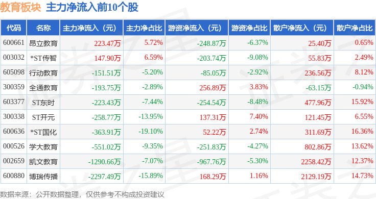 从资金流向上来看,当日教育板块主力资金净流出3.34亿元,游资资金净流入3798.35万元,散户资金净流入2.96亿元。教育板块个股资金流向见下表: