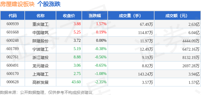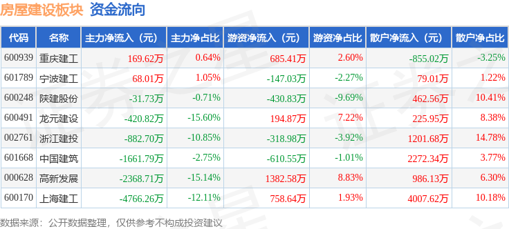 从资金流向上来看,当日房屋建设板块主力资金净流出9894.39万元,游资资金净流入1514.11万元,散户资金净流入8380.28万元。房屋建设板块个股资金流向见下表: