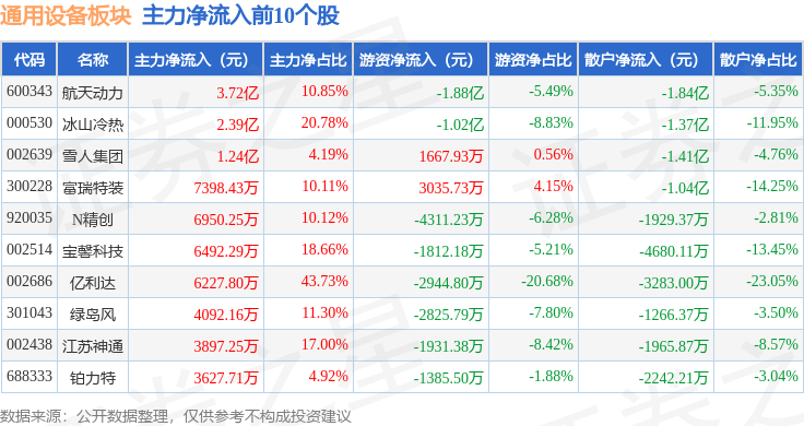 从资金流向上来看,当日通用设备板块主力资金净流出4.41亿元,游资资金净流入1.4亿元,散户资金净流入3.01亿元。通用设备板块个股资金流向见下表: