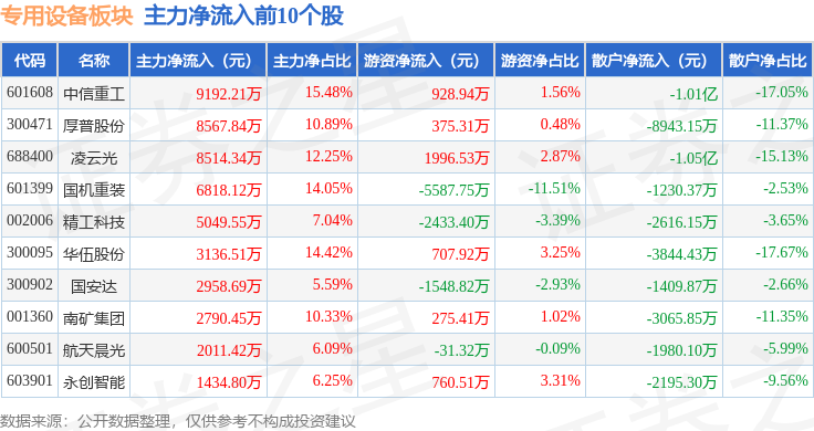 从资金流向上来看,当日专用设备板块主力资金净流出14.0亿元,游资资金净流入6.21亿元,散户资金净流入7.79亿元。专用设备板块个股资金流向见下表:
