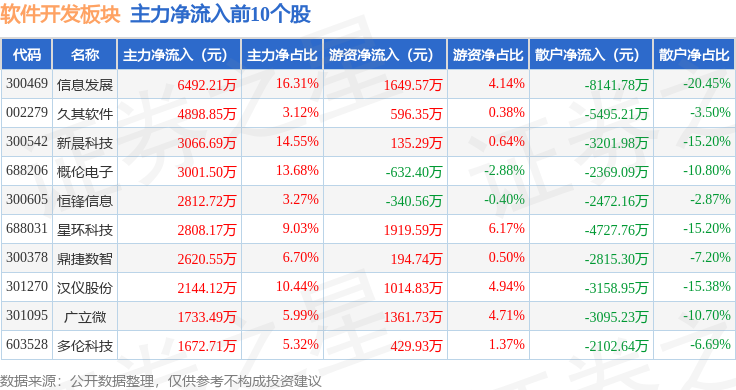 从资金流向上来看,当日软件开发板块主力资金净流出23.22亿元,游资资金净流入8.58亿元,散户资金净流入14.64亿元。软件开发板块个股资金流向见下表: