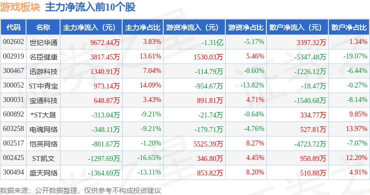 从资金流向上来看,当日游戏板块主力资金净流出6.65亿元,游资资金净流入2.55亿元,散户资金净流入4.09亿元。游戏板块个股资金流向见下表: