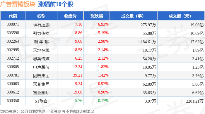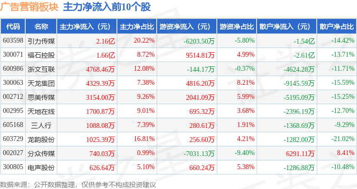 从资金流向上来看,当日广告营销板块主力资金净流出6.01亿元,游资资金净流入2.0亿元,散户资金净流入4.01亿元。广告营销板块个股资金流向见下表: