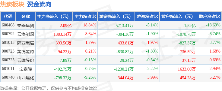 从资金流向上来看,当日焦炭板块主力资金净流入2.16亿元,游资资金净流出7330.19万元,散户资金净流出1.43亿元。焦炭板块个股资金流向见下表: