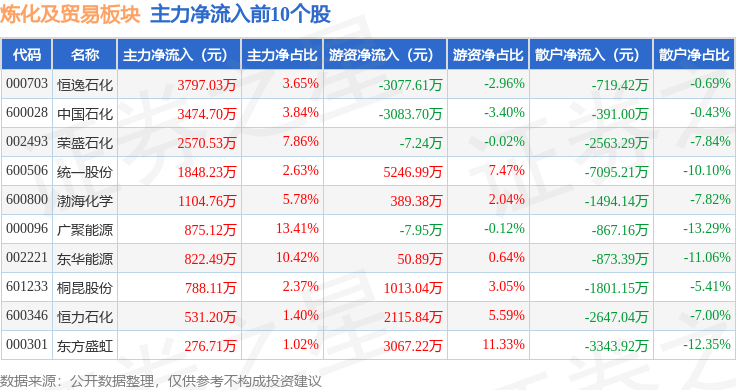 从资金流向上来看,当日炼化及贸易板块主力资金净流入639.17万元,游资资金净流入8086.01万元,散户资金净流出8725.18万元。炼化及贸易板块个股资金流向见下表: