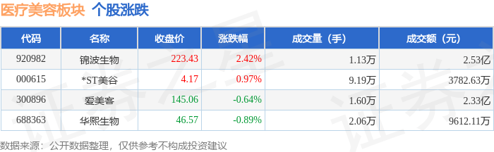证券之星消息,12月2日医疗美容板块较上一交易日下跌0.65%,华熙生物领跌。当日上证指数报收于3897.71,下跌0.42%。深证成指报收于13056.7,下跌0.68%。医疗美容板块个股涨跌见下表: