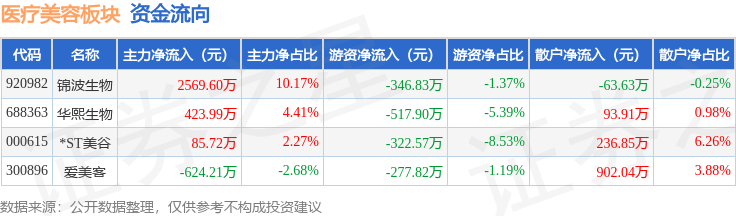 从资金流向上来看,当日医疗美容板块主力资金净流出114.5万元,游资资金净流出1118.29万元,散户资金净流入1232.79万元。医疗美容板块个股资金流向见下表: