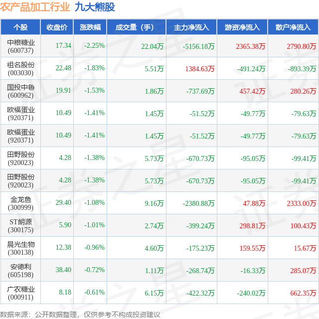 个股表现方面,农产品加工行业当日领跌股为中粮糖业(600737),该股当日报收17.34,下跌2.25%,成交量22.04万,主力资金净流出5156.18万元。祖名股份(003030)以下跌1.83%紧随其后,该股当日成交量5.51万,主力资金净流入1384.63万元。除此之外,国投中鲁(600962)、欧福蛋业(920371)、欧福蛋业(920371)均进入当日熊股之列。具体个股列表见下表: