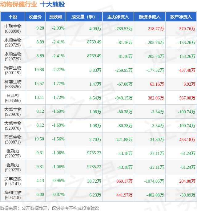 个股表现方面,动物保健行业当日领跌股为申联生物(688098),该股当日报收9.28,下跌2.93%,成交量4.09万,主力资金净流出789.53万元。永顺生物(920729)以下跌2.41%紧随其后,该股当日成交量8769.0,主力资金净流出81.16万元。除此之外,永顺生物(920729)、瑞普生物(300119)、科前生物(688526)均进入当日熊股之列。具体个股列表见下表: