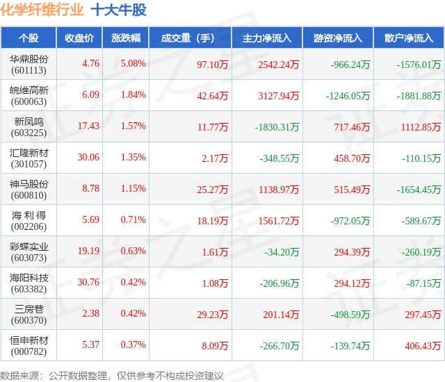 个股表现方面,化学纤维行业当日领涨股为华鼎股份(601113),该股当日报收4.76,上涨5.08%,成交量97.1万,主力资金净流入2542.24万元。皖维高新(600063)以上涨1.84%紧随其后,该股当日成交量42.64万,主力资金净流入3127.94万元。除此之外,新凤鸣(603225)、汇隆新材(301057)、神马股份(600810)均进入当日牛股之列。具体个股列表见下表: