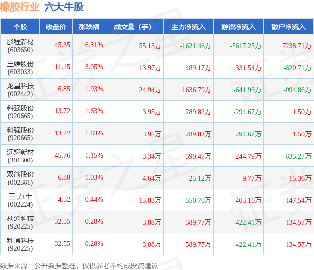 个股表现方面,橡胶行业当日领涨股为彤程新材(603650),该股当日报收45.35,上涨6.31%,成交量55.13万,主力资金净流出1621.46万元。三维股份(603033)以上涨3.05%紧随其后,该股当日成交量13.97万,主力资金净流入489.17万元。除此之外,龙星科技(002442)、科强股份(920665)、科强股份(920665)均进入当日牛股之列。具体个股列表见下表: