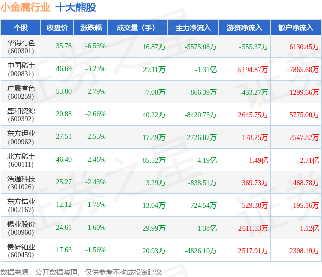 个股表现方面,小金属行业当日领跌股为华锡有色(600301),该股当日报收35.78,下跌6.53%,成交量16.87万,主力资金净流出5575.08万元。中国稀土(000831)以下跌3.23%紧随其后,该股当日成交量29.11万,主力资金净流出1.31亿元。除此之外,广晟有色(600259)、盛和资源(600392)、东方钽业(000962)均进入当日熊股之列。具体个股列表见下表: