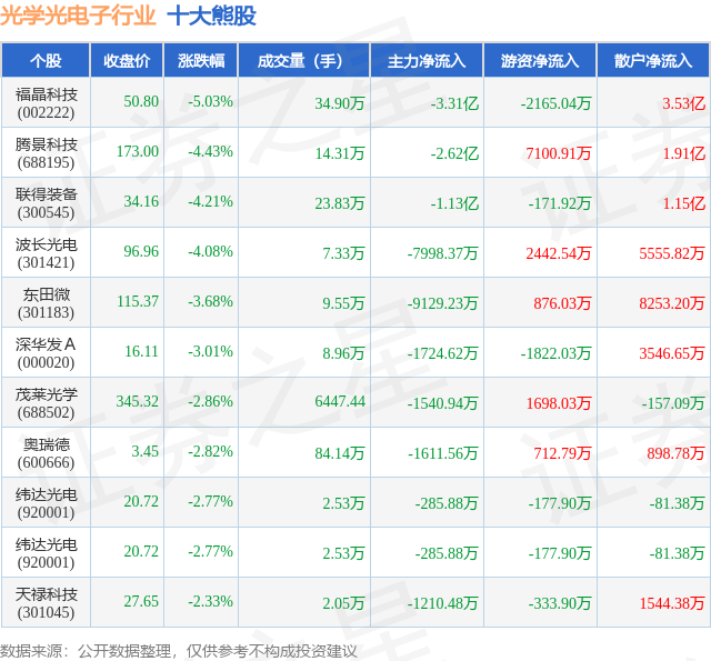 个股表现方面,光学光电子行业当日领跌股为福晶科技(002222),该股当日报收50.8,下跌5.03%,成交量34.9万,主力资金净流出3.31亿元。腾景科技(688195)以下跌4.43%紧随其后,该股当日成交量14.31万,主力资金净流出2.62亿元。除此之外,联得装备(300545)、波长光电(301421)、东田微(301183)均进入当日熊股之列。具体个股列表见下表: