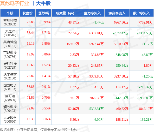 个股表现方面,其他电子行业当日领涨股为睿能科技(603933),该股当日报收27.85,上涨9.99%,成交量48.17万,主力资金净流出1.47亿元。久之洋(300516)以上涨6.71%紧随其后,该股当日成交量22.34万,主力资金净流入6367.01万元。除此之外,英唐智控(300131)、百邦科技(300736)、好利科技(002729)均进入当日牛股之列。具体个股列表见下表: