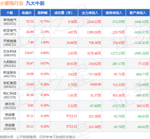 个股表现方面,小家电行业当日领涨股为莱克电气(603355),该股当日报收33.52,上涨6.75%,成交量9.58万,主力资金净流入2214.22万元。欧圣电气(301187)以上涨2.13%紧随其后,该股当日成交量4.07万,主力资金净流入1399.2万元。除此之外,开能健康(300272)、石头科技(688169)、九阳股份(002242)均进入当日牛股之列。具体个股列表见下表:
