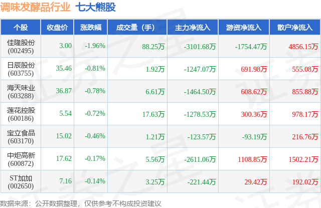 个股表现方面,调味发酵品行业当日领跌股为佳隆股份(002495),该股当日报收3.0,下跌1.96%,成交量88.25万,主力资金净流出3101.68万元。日辰股份(603755)以下跌0.81%紧随其后,该股当日成交量1.92万,主力资金净流出1247.07万元。除此之外,海天味业(603288)、莲花控股(600186)、宝立食品(603170)均进入当日熊股之列。具体个股列表见下表: