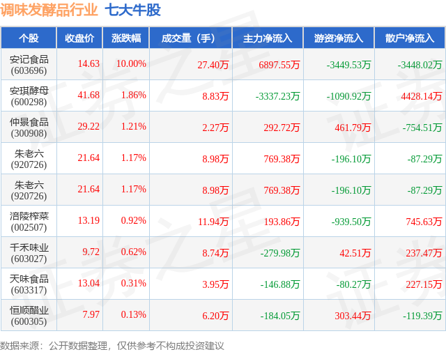 个股表现方面,调味发酵品行业当日领涨股为安记食品(603696),该股当日报收14.63,上涨10.0%,成交量27.4万,主力资金净流入6897.55万元。安琪酵母(600298)以上涨1.86%紧随其后,该股当日成交量8.83万,主力资金净流出3337.23万元。除此之外,仲景食品(300908)、朱老六(920726)、朱老六(920726)均进入当日牛股之列。具体个股列表见下表: