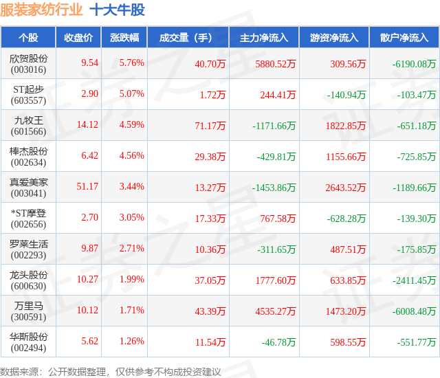 个股表现方面,服装家纺行业当日领涨股为欣贺股份(003016),该股当日报收9.54,上涨5.76%,成交量40.7万,主力资金净流入5880.52万元。ST起步(603557)以上涨5.07%紧随其后,该股当日成交量1.72万,主力资金净流入244.41万元。除此之外,九牧王(601566)、棒杰股份(002634)、真爱美家(003041)均进入当日牛股之列。具体个股列表见下表: